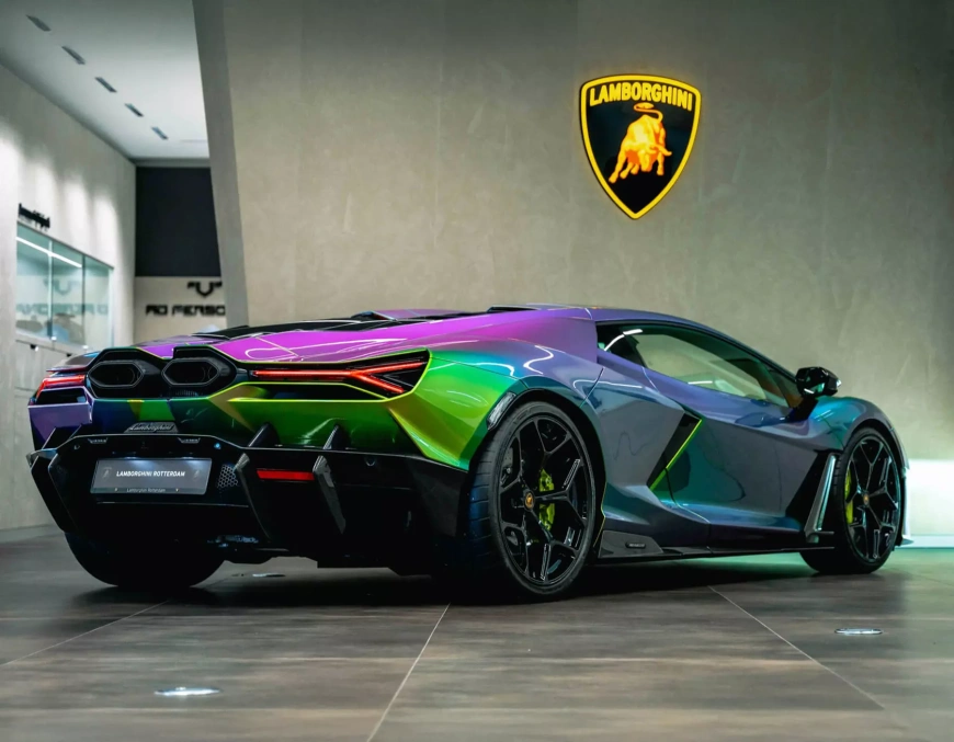 Главным оттенком в цветовой гамме краски является зелёный, что, конечно, объясняет наличие «Verde» в названии модели. Если посмотреть на кузов, окрашенный этой краской под разными углами, оттенок будет меняться. Он переливается из одного оттенка голубого, красного и жёлтого в другой. Надо сказать, что такие переливы очень эффектно смотрятся именно на новом Revuelto.
