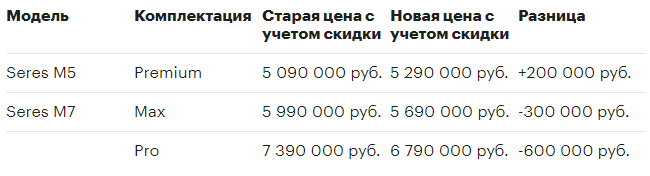 Сокращена скидка на X70 Plus 2024 года до 100 тыс рублей, что повысило итоговую цену.Seres: разные изменения на M5 и M7