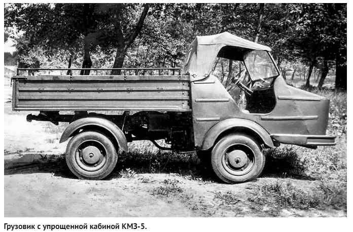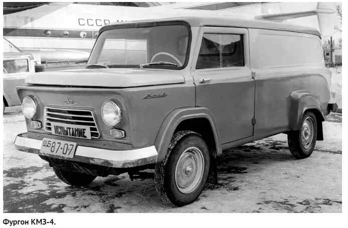 Киевский мотоциклетный завод после войны копировал немецкие модели, а затем выпускал М-72 и К-750. В 1959-м они построили первый мини-грузовик КМЗ-1 на узлах К-750. Четырёхтактный оппозитный двигатель 0,75 л (26 "лошадей") разместили под кузовом с задней части.Коробку передач и реверс позаимствовали у серпуховской мотоколяски. Кабина была выполнена из стеклопластика — материала будущего, о котором трубили все газеты в эпоху химических прорывов.