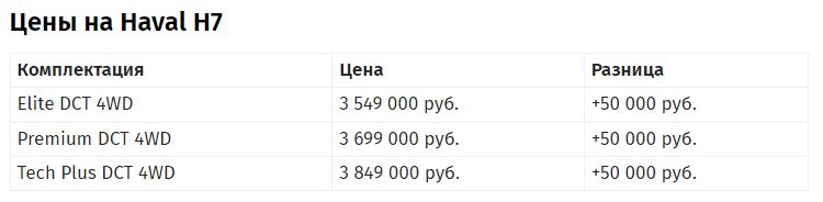 Завершает список внедорожник H7, признанный самым устойчивым к коррозии среди китайских SUV в России. Во всех трех комплектациях цена поднялась на 50 тысяч. Модель сегмента SUV-D6 с габаритами 4,7x1,9x1,7 м, колесной базой 2,8 м и клиренсом 200 мм оснащена 2-литровым турбомотором на 192 силы, роботом и подключаемым полным приводом с электронной муфтой.