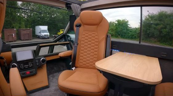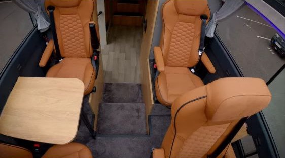 Внутри вас ждет не просто салон, а целая квартира-студия на колесах. Здесь два просторных ряда сидений. Кресло водителя вращается и разворачивается к пассажирам, создавая уютную атмосферу для общения. А чтобы ему ничего не мешало, руль можно поднять вверх — такого вы точно не видели больше ни у одного автодома.
